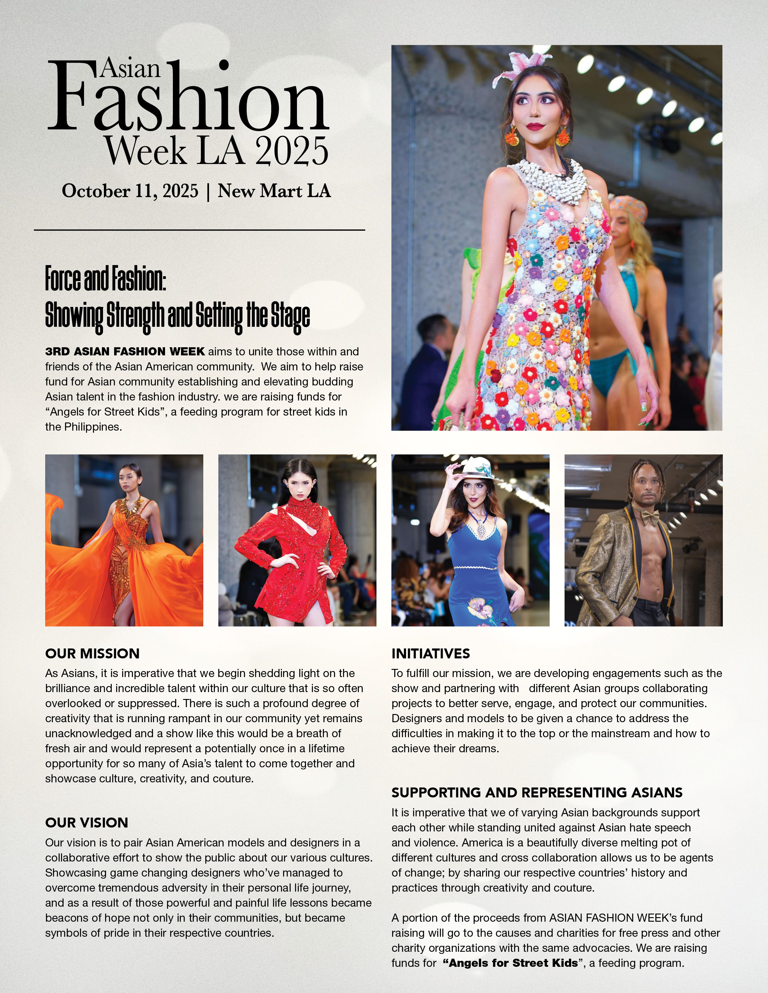 Asian Fashion Week LA 2025 showcases Asian talent and cultural pride while raising funds for Angels for Street Kids, supporting communities through creativity and culture.