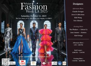 Asian Fashion Week LA 2025, set for Oct. 11 at The New Mart in Los Angeles, featuring designers Charlie Designs, Jesse J Collections, Kiki Wang, Eric Glennie, The Phukaw, Edwin Uy, Jean Amour, Katniss, and Kiel Ortega.