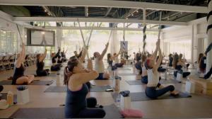 A woman practicing sword yoga at WeaponUp's in person event in Miami